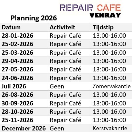 Volg ons voor het laatste nieuws ook op Facebook: https://www.facebook.com/RepairCafeVenray, of kijk op onze website: www.repaircafevenray.nl